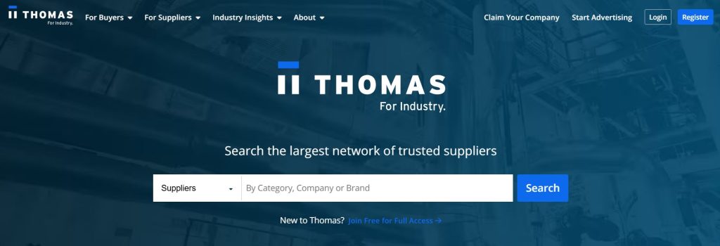 ThomasNet, a well-established industrial B2B marketplace, showcases another path to monetizing data — through AI-powered advertising and buyer analytics. The platform connects manufacturers, distributors, and procurement professionals across thousands of industrial categories. Every interaction on ThomasNet — from product searches to profile views — generates data that reveals buyer intent and purchasing behavior.