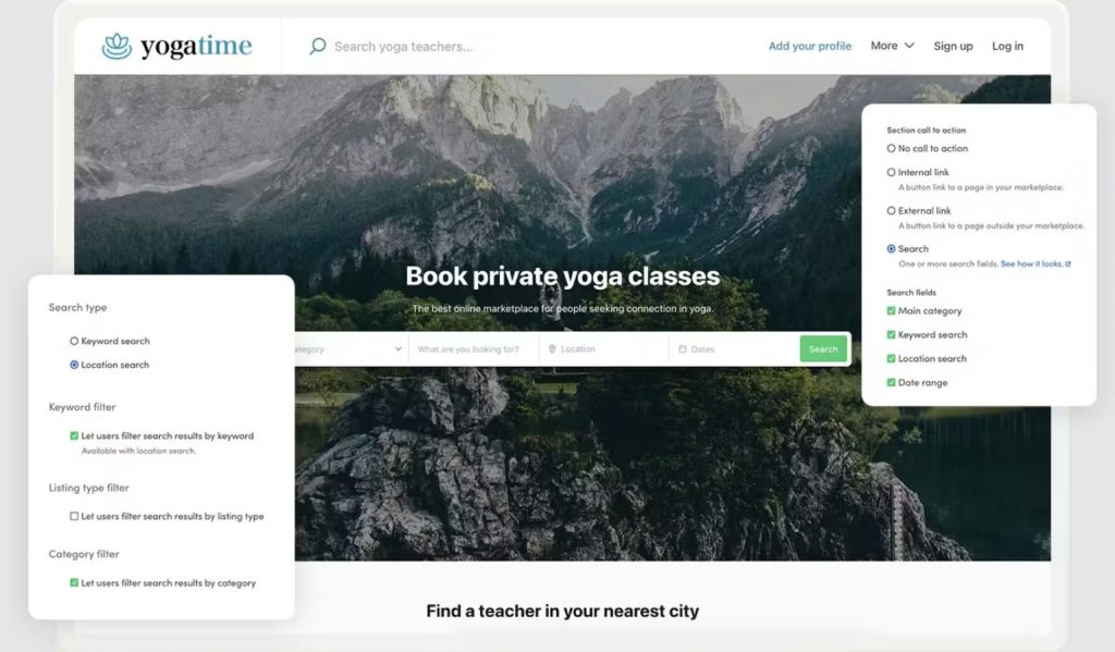 Categories and subcategories help you organize your platform into clear service areas. Listing fields allow providers to specify important details—experience, certifications, pricing, service types—which customers can filter through. Search settings enable keyword search, location-based search, price filters, and availability filters. You can even add a search bar to your landing page, guiding customers directly into browsing from the moment they arrive.