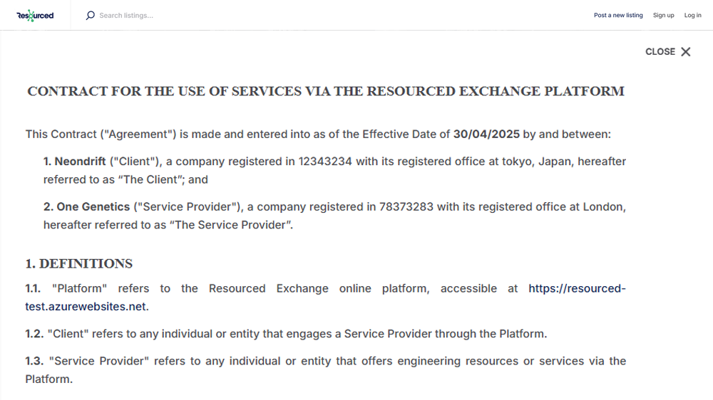 Once an offer is accepted, the system generates a formal Transaction or Work Contract outlining the terms of engagement. This includes scope of work, agreed rates, timelines, payment structure, deliverables, and responsibilities. By automating contract creation, Resourced reduces administrative overhead and ensures clear expectations on both sides. This standardization also protects both parties and facilitates smoother project execution.