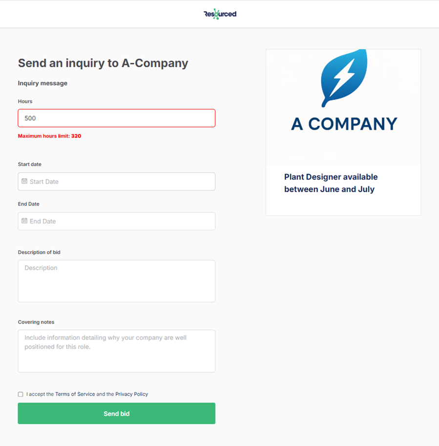 The Reverse Marketplace is one of the most powerful features of Resourced. Instead of only browsing available providers, companies with immediate needs can post their Hourly Booking Requirements, specifying the skills they require, duration, timeline, and estimated budget. Service providers can then respond with their available resources. This turns the hiring process on its head by empowering clients to announce their needs and receive incoming proposals, significantly reducing time spent searching for professionals.