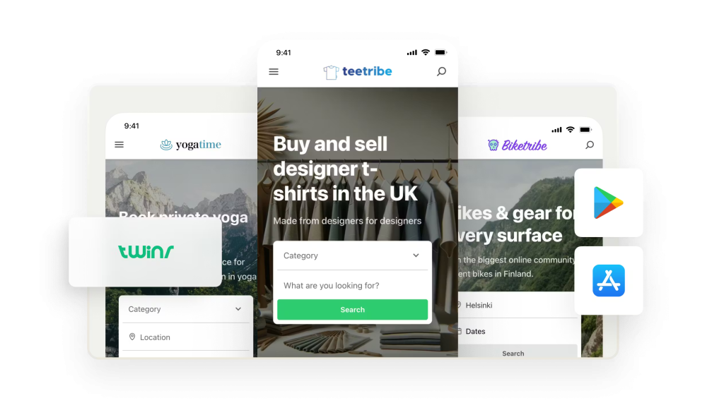That’s why Sharetribe has partnered with Twinr, a no-code mobile app wrapper, to help marketplace operators launch iOS and Android apps quickly—without writing a single line of mobile code.