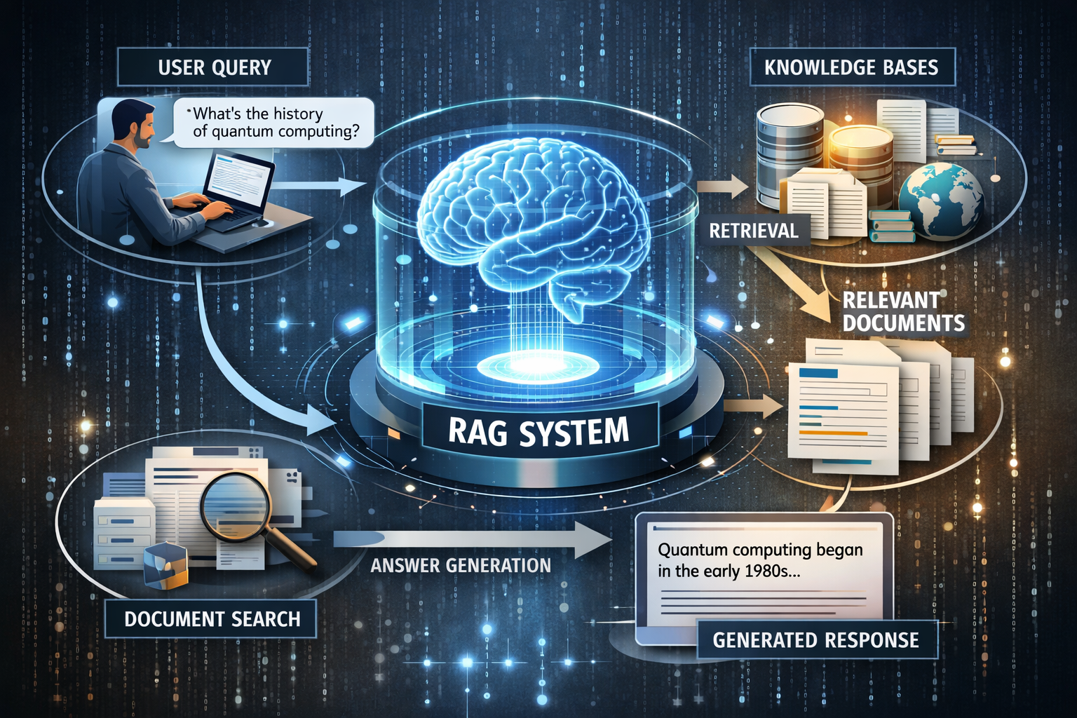 A Retrieval-Augmented Generation (RAG) system is an architecture that enhances a language model by connecting it to an external knowledge source. Instead of relying solely on what the model learned during training, the system first retrieves relevant documents from a database (such as vector stores, APIs, or internal knowledge bases) and then uses those documents to generate a response.