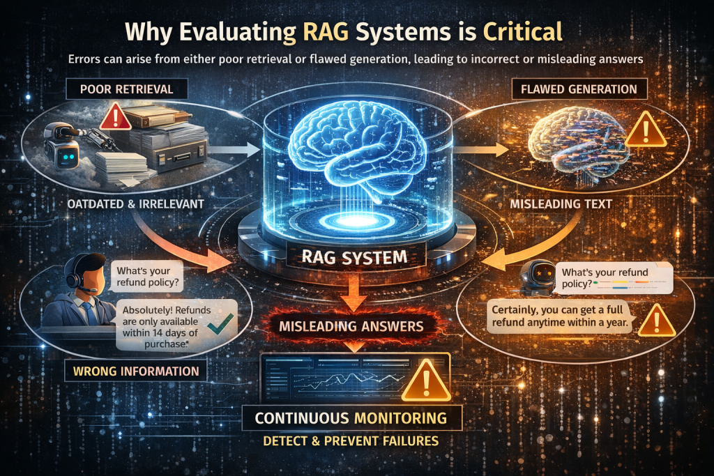Evaluation is critical because RAG systems introduce multiple points of failure across both retrieval and generation. Unlike standalone LLMs, where errors mainly come from generation, RAG systems depend on fetching the right context and using it correctly. If either step fails, the final answer becomes unreliable.
