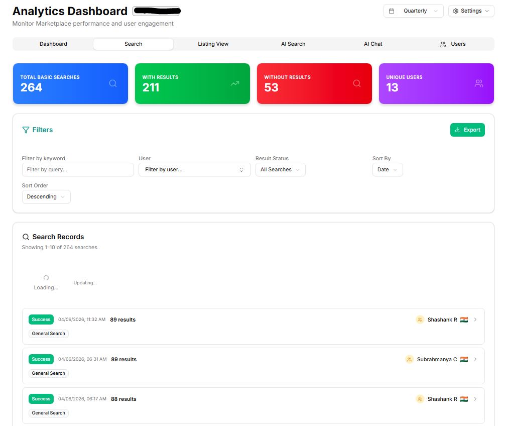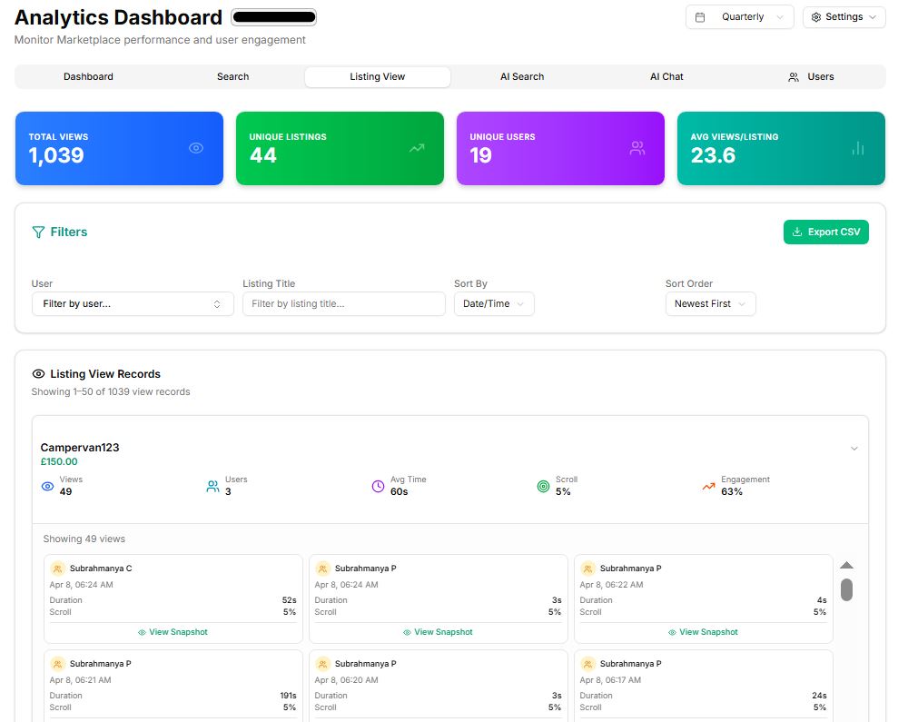 With advanced filtering and export capabilities, admins can further analyze trends, share insights with stakeholders, and continuously improve listing quality, ultimately driving higher engagement and better conversion rates across the marketplace.