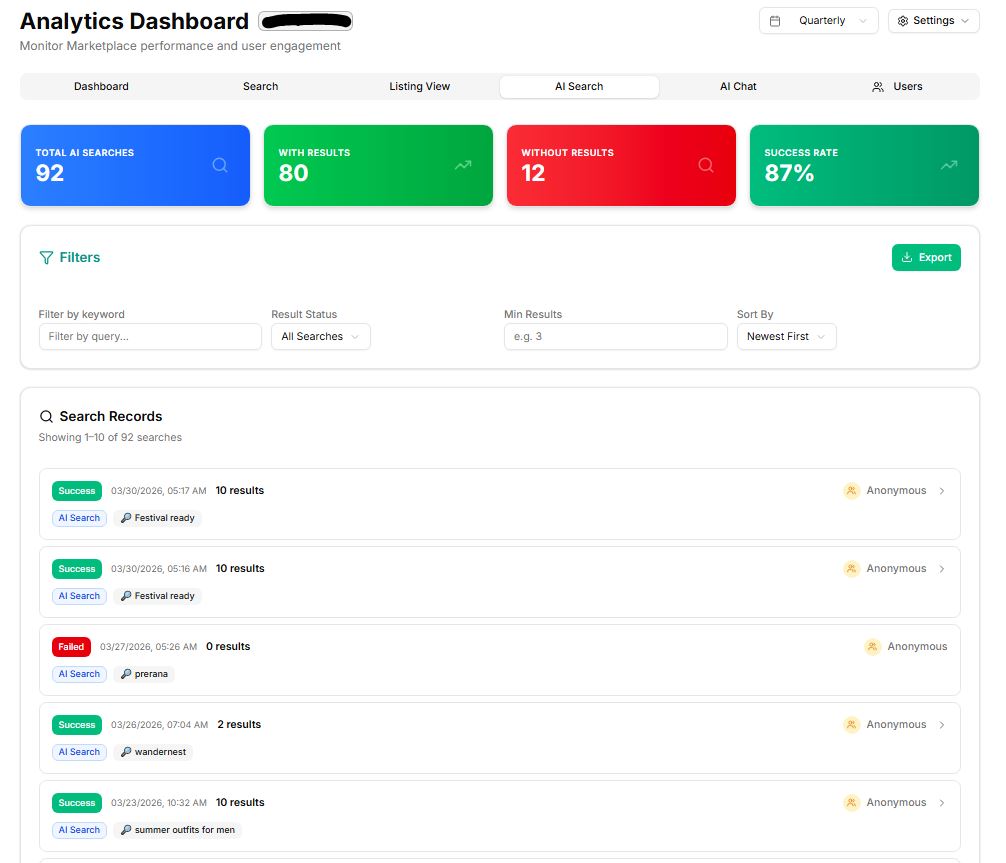 As marketplaces adopt AI-driven features, measuring their effectiveness becomes essential. Aykan’s AI Search Analytics provides clear visibility into how AI-powered search is performing and how it influences user experience and discovery.