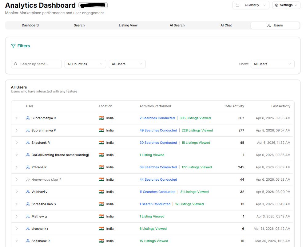 This level of detail provides deep insights into how users interact with specific listings, enabling admins to identify patterns such as high interest but low conversion, or strong engagement in certain regions.