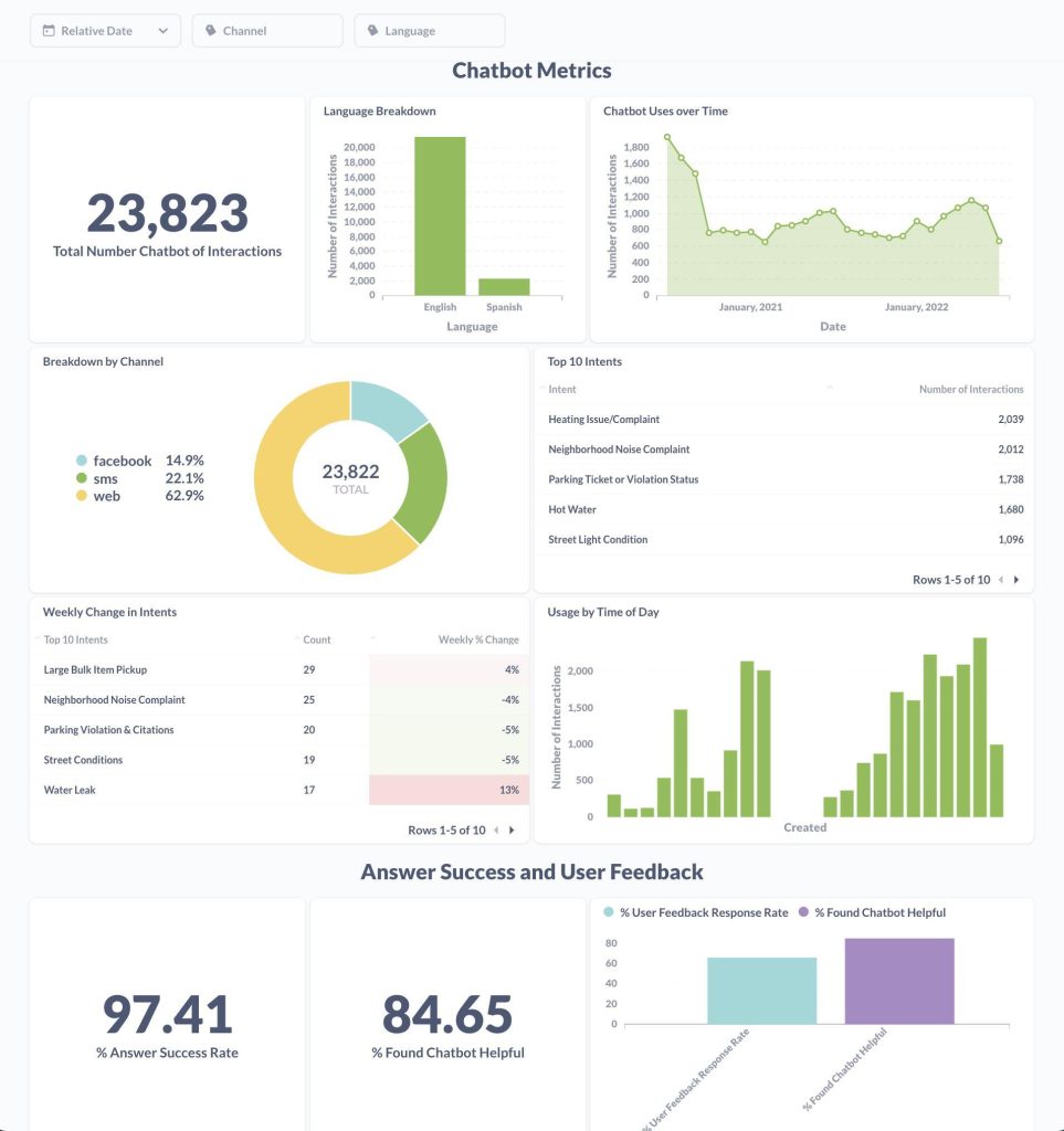 Organizations can track key performance metrics such as message volume, completion rates, response times, and error rates in real time. These metrics help evaluate how efficiently the system is operating and where improvements may be needed. At a deeper level, intent analytics reveal what users are asking most frequently, whether it’s profile updates, searches, or knowledge queries, helping teams identify demand patterns, unmet needs, and opportunities for enhancement.